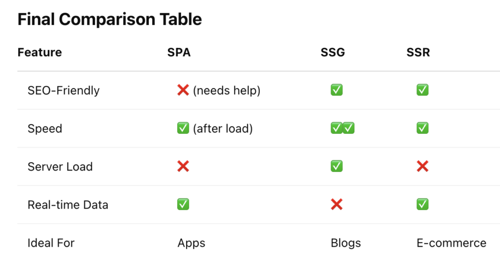 In the world of web development, understanding the differences between SPAs (Single Page Applications), SSGs (Static Site Generators), and SSR (Server-Side Rendering) is crucial for choosing the right architecture for your project. Each has its strengths, weaknesses, and ideal use cases.
