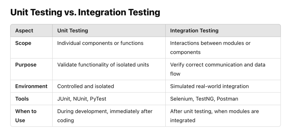 Software development involves multiple layers of testing to ensure reliability and functionality. Two critical types of testing, unit testing and integration testing, focus on different aspects of the codebase but work together to create a robust application.